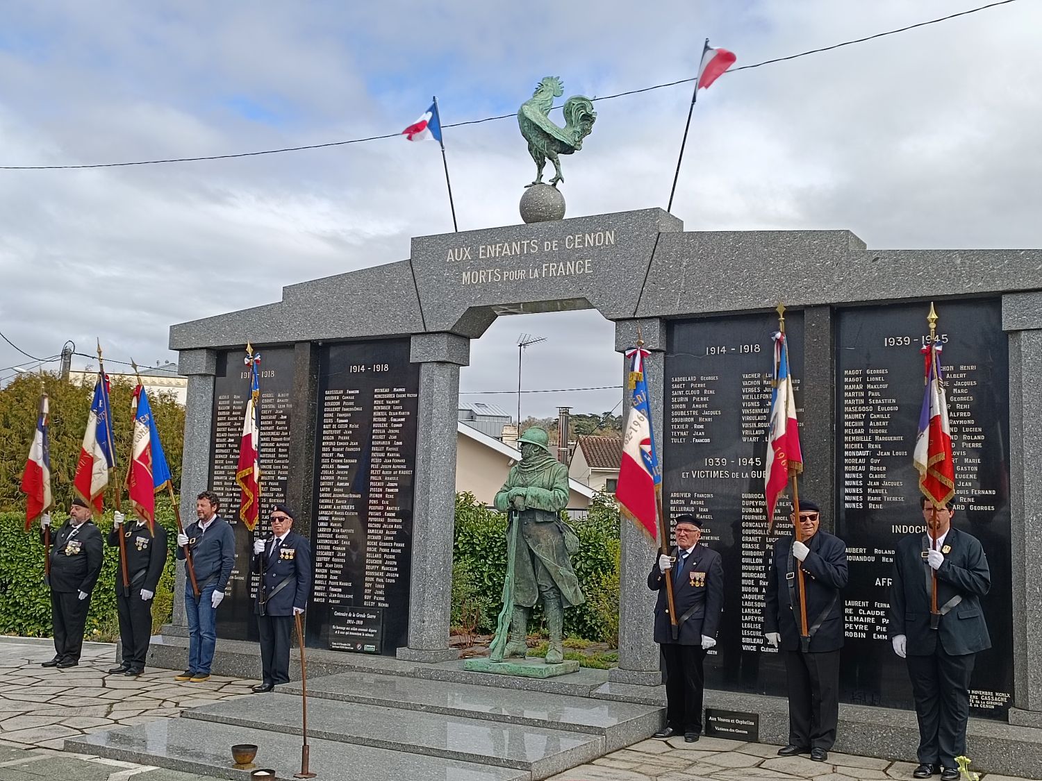 La municipalité alloue 2 000 francs au Comité du monument des soldats morts pour la France pour l’accomplissement de l’œuvre. L’élaboration des plans est confiée à Robert Mialhe, qui y inclut le soldat inconnu et le coq, moulages des sculptures de René Bertrand-Boutée réalisées pour les monuments aux morts du pays. Inauguré le 11 novembre 1923, l’édifice rend hommage aux 168 soldats cenonnais disparus lors de la première guerre.