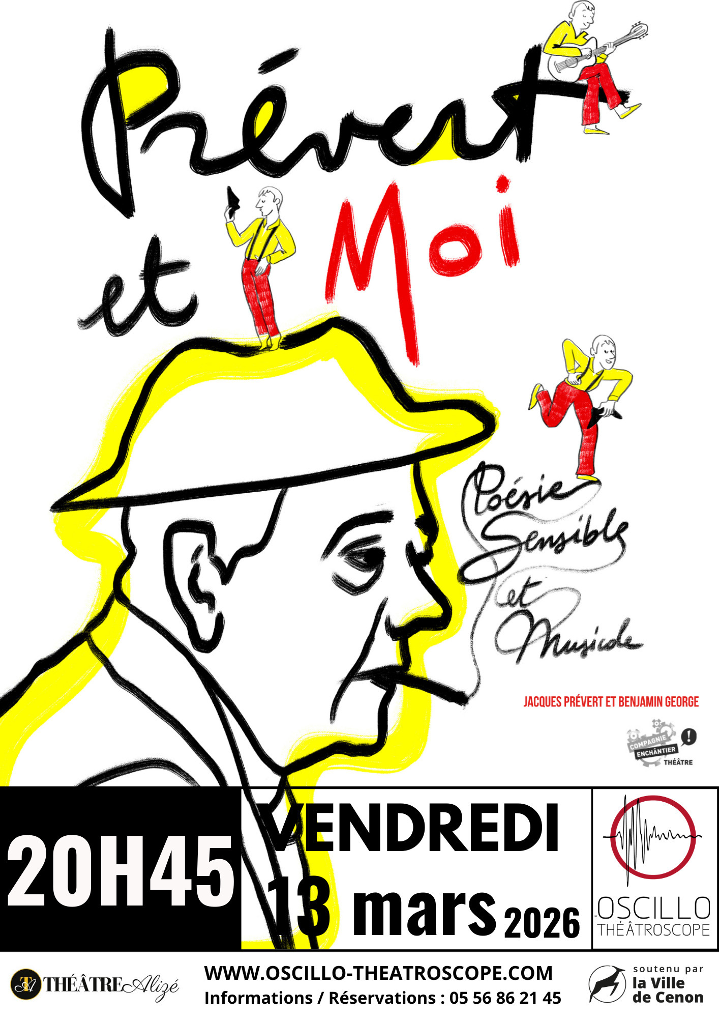 Date de début Min Maximum Date de fin Min Maximum Mot(s) clé(s) Type - Tout -Animation - JeuxAtelier - Stage - FormationCérémonie - InaugurationCinéma - ProjectionConcertConférence - RencontreCongrès - ColloqueConseil de métropoleRéunion publique - ConcertationEmploi - Insertion - EntrepreneuriatÉvénement sportifExpositionFête - FestivalSalon - FoireCérémonie - InaugurationLectureMarché - Vide grenier - Vide dressingRéunion publique - ConcertationRendez-vous solidaireSpectacleVisite - Balade Public - Tout -Jeune publicProfessionnelPublic adulteSéniorTout public Lieu Entrée gratuite Tout Oui Non Actuellement 29 événement(s) à Cenon Sarah et le cri de la langouste Spectacle Le 6 février 2026 En savoir + Scroll Spectacle Le 6 février 2026 En savoir + TOUTOUIG LALA Spectacle Le 25 février 2026 En savoir + TOUTOUIG LALA Spectacle Le 25 février 2026 En savoir + Merci Simone Spectacle Le 27 février 2026 En savoir + En Impro Simone ! Spectacle Le 28 février 2026 En savoir + FAIS GAFFE À C'QUE T'ÉCOUTES ?! Spectacle Le 4 mars 2026 En savoir + FÉLIX RADU Spectacle Le 5 mars 2026 En savoir + Princesse, Amour et Powerpoint Spectacle Le 6 mars 2026 En savoir + Prévert et moi Spectacle Le 13 mars 2026 En savoir + Les Messagers Spectacle Le 13 mars 2026 En savoir + "Mamie Mémoire" - ANNULE Spectacle Le 13 mars 2026 En savoir + A-t-on toujours raison? Spectacle Le 19 mars 2026 En savoir + Ta mère la mieux Tour Spectacle Le 20 mars 2026 En savoir + Je veux voir Mioussov ! Spectacle Le 20 mars 2026 En savoir + Poèmes du silence Spectacle Le 21 mars 2026 En savoir + Pom Pom Poèmes Spectacle Le 21 mars 2026 En savoir + Le cabaret des #MEMEPASPEUR Spectacle Le 27 mars 2026 En savoir + BURLESK Ô JAZZ FESTIVAL Spectacle Le 28 mars 2026 En savoir + L'année de la gagne Spectacle Le 3 avril 2026 En savoir + Les Pieuvres Spectacle Le 3 avril 2026 En savoir + La dernière lettre Spectacle Le 24 avril 2026 En savoir + Le délirium du papillon Spectacle Le 25 avril 2026 En savoir + Concert tôt... Trio Selima Spectacle Le 30 avril 2026 En savoir + ANIMAUX TOTEM Spectacle Le 6 mai 2026 En savoir + Les Gorgones, émission de télé-théâtralité Spectacle Le 8 mai 2026 En savoir + Tant qu'il ne pleut pas Spectacle Le 22 mai 2026 En savoir + Le cabaret des #MEMEPASPEUR Spectacle Le 29 mai 2026 En savoir + Malis, la vieille femme et la joie Spectacle Le 29 mai 2026 En savoir + S'abonner à Evenements